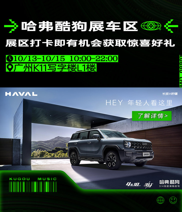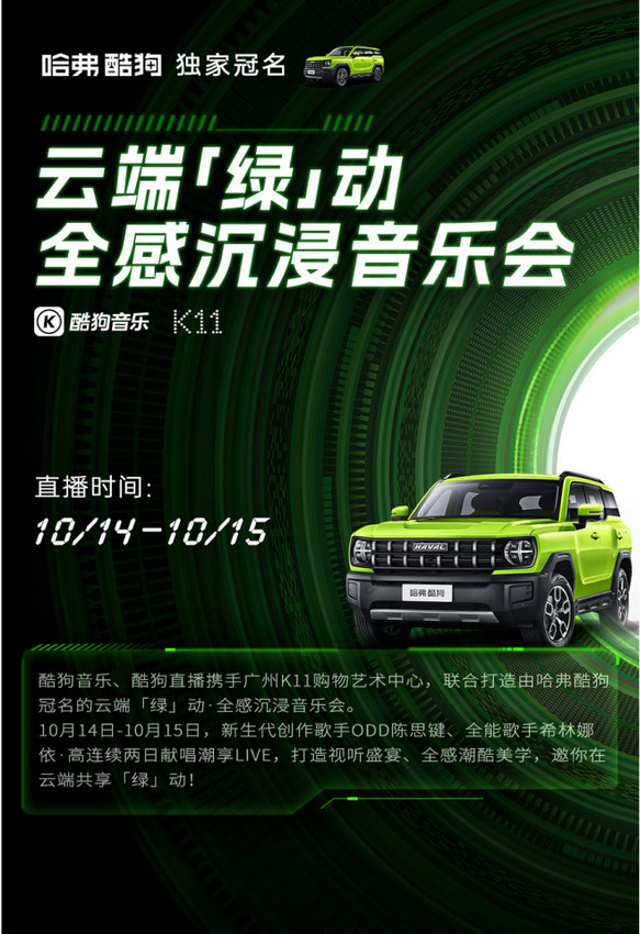 在此之前,酷狗音乐已与广州K11购物艺术中心联手打造了多场音乐LIVE,高品质、高水准演出内容赢得了乐迷粉丝及行业的广泛好评和高口碑。此次哈弗酷狗的加入,三方将共创更多元的科技型音乐现场以及音乐科技新玩法。同时,本场音乐会还将通过酷狗直播APP全程直播,歌手、歌迷齐聚云端,一起制躁“全感「绿」动”。